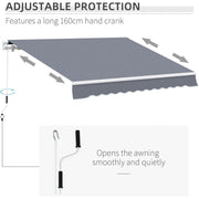 With a sturdy aluminum and steel blend frame, this Outsunny sun canopy awning is ideal for creating shade when needed. The thick 280gsm polyester canopy will protect you from any excessive heat and sunlight to keep you cool and comfortable. It can be easily mounted on the wall with the included accessories. The garden canopy retractable operation means you can open and close it whenever - a fuss-free way to extend your time in the Summer safely and comfortably.