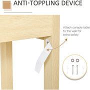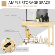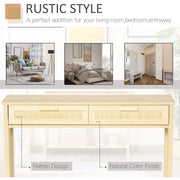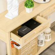 Bring the natural beauty of outside into your inside styling with this console table from HOMCOM. Here we see woven rattan panels on both drawers, playing contrast to the smooth wood-effect of the main structure. It also amps up the striking look of the whole piece, which looks great by itself or mixed with other furniture. It comes with two drawers, a bottom shelf and a flat table top, so there's plenty of storage room. Finished with four small feet to elevate and long handles to open and close the drawers easily.