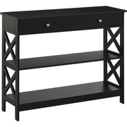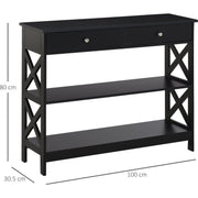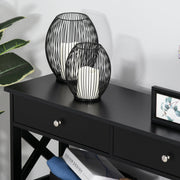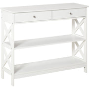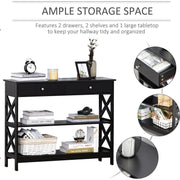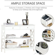This elegant console table offers a sleek and simple style with generous storage and safety-conscious wall straps for peace of mind with children or pets in the home. Its solid MDF construction and two drawers and two shelves provide plenty of practical storage, while brushed handles contrast gracefully against the block colour. An open-top provides extra display and holding space.