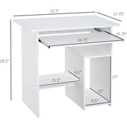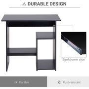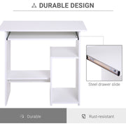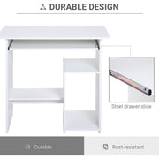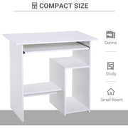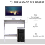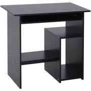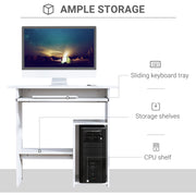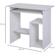 This compact computer desk is a simple but extremely useful addition for the home desk is spacious enough to carry work out peacefully. Made from thick particle board in a fresh finish, this sturdy and durable piece is crafted into a design which features a slide-out keyboard tray, CPU stand, two open storage shelves and a large worktop. Smooth on top, the non-scratch melamine surface is easy to clean and maintain, making it perfect for busy lifestyles.