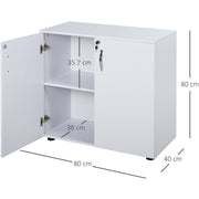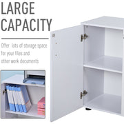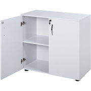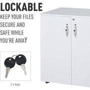 Keep the office organised and the area looking beautiful with this White storage cabinet from HOMCOM. With two hinged doors for easy access, inside a longline shelf sits to create two tiers for organisation of your files and papers. Made from particle board, this piece is tough and durable for everyday use. It's finished with feet to protect your floor and a lock for security. Comes with two keys.