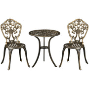 Embrace the classic elegance of our 3-Piece Cast Aluminium Bistro Set. Beautifully finished in bronze, the set includes two chairs and a matching table, all adorned with a charming floral cut-out design. Each piece, crafted from robust cast aluminium, promises strength and durability, making the set perfect for outdoor use. The table comes with a 48mm diameter hole in the middle, designed to secure a parasol for comfortable shade. Experience the blend of style, convenience, and longevity with this exquisite bistro set.