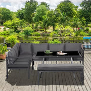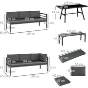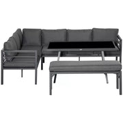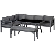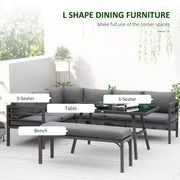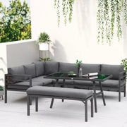 Upgrade your outdoor living space with the Outsunny Aluminium Outdoor Dining Set L-Shaped 8-Seater in elegant grey. Experience the perfect blend of comfort and style as you relax in this contemporary furniture set. With two spacious 3-seater sofas, a versatile bench, and a large dining table, accommodating up to 8 people is effortless. Sink into the plush backrest and seat cushions, providing unrivalled comfort for long conversations and leisurely meals. Crafted from durable aluminium, this set is built to withstand the elements, ensuring lasting enjoyment in your garden or patio. Create unforgettable moments with friends and family, surrounded by the luxury and sophistication of this outdoor dining set.