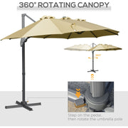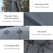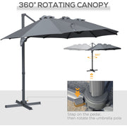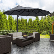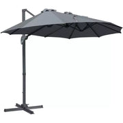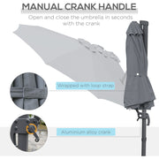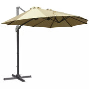 Get ready to enjoy the sunshine like never before with this large double-sided cantilever parasol! This innovative patio umbrella boasts a sturdy 12-rib design that provides exceptional support to its large and durable polyester canopy. Say goodbye to harsh UV rays, thanks to its effective sun-blocking features and top vents that promote proper air circulation. With an easy-to-use hand crank, adjusting the angle of this parasol is a breeze, while the cross base allows you to rotate the entire setup, so you can always find the perfect spot. And with its included base, you'll have everything you need to kick back and relax in style. Get yours now and experience a summer like no other
