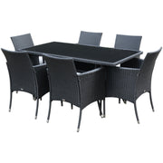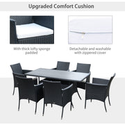 Introducing the Outsunny 6 Seater Rattan Patio Dining Set, the epitome of outdoor elegance and comfort. This deluxe 7-piece set, featuring one table and six armchairs, is meticulously crafted from high-quality PE rattan and supported by a durable steel structure, promising both sturdiness and longevity. Adorned with a 5mm thick tempered glass tabletop, it offers a perfect setting for daily meals or extended conversations with loved ones. Designed for ease of maintenance, a simple wipe with a damp cloth is all it takes to keep it looking pristine.