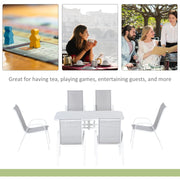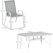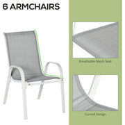 Elevate your outdoor dining experience with the Outsunny 6-Piece Garden Dining Set. Boasting a modern and stylish design, the set includes six comfortable garden dining chairs and a rectangular glass-top table with a parasol umbrella hole. The rust-resistant metal frames of each piece provide exceptional durability, while the breathable mesh chairs keep you cool and relaxed on hotter days. Perfect for dining with family and friends, this versatile set is a fantastic addition to your patio, garden or balcony all year round. Upgrade your outdoor space today with the Outsunny 6-Piece Garden Dining Set.