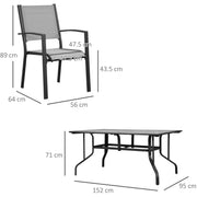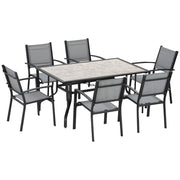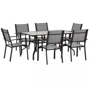 Enhance your outdoor living with this weather-resistant 6-seater dining set from Outsunny. Relax in comfort with breathable mesh armchairs and a spacious table fitted with a parasol hole. The durable plastic table top ensures fuss-free dining while the rust-proof frame guarantees longevity. Its sleek grey finish and modern design make it a perfect fit for any garden or patio. Foldable chairs allow for easy storage, and adjustable legs offer stability on uneven ground. Upgrade your outdoor experience today with this stylish garden dining set.