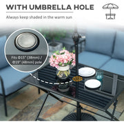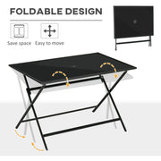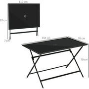 Create a simple yet inviting dining space on any deck or patio with this charming foldable garden dining table from Outsunny. The sturdy metal frame with non-slip foot pads is stable and designed to last for years, and is foldable to compact size for space-saving storage. Featuring a tempered glass tabletop with a parasol hole in the middle to bring a sleek feeling and cool shade. Add enduring beauty, style and grace to your environment with this essential part of any outdoor living space.