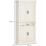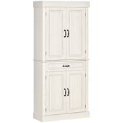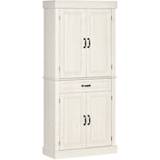 Create more storage space while adding style with this HOMCOM kitchen larder cupboard. Featuring a wood grain veneer, raised door panels, and antiqued metal hardware, this kitchen cupboard has charm and elegance. Equipped with two cabinets and a drawer, this pantry cupboard gives you space to place your plates or utensils. With its compact design and excellent storage capabilities, this larder unit will become your new favourite piece of furniture.
