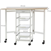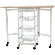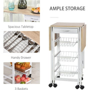 Kitchen Trolley on Wheels, Drop Leaf, 3 Baskets, White Oak