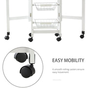Add extra storage to your home with this rolling kitchen cabinet from HOMCOM. Designed with functionality in mind, it features three steel drawers for keeping vegetables, fruit, plates etc. in, with the top drawer perfect for utensils and cutlery. An oak tone countertop provides extra holding and productivity room, with its drop-leaf design expanding when more space is required. Six onmi-directional wheels allow this piece to move around smoothly without marking your floor. Maximise your space with minimal effort.