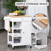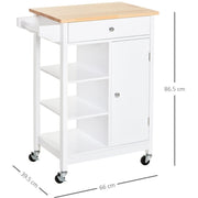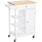 Organise your kitchen with this stylish rolling cart from HOMCOM. The frame, made from MDF, is durable and reliable for everyday use, and is made into a design which features three open side shelves, one cupboard, one top drawer and a side hanging rail. A wooden tabletop provides extra preparation room. A compact and functional piece which is a must-have companion in your home.