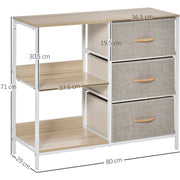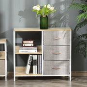Opt for a soft approach to home storage - go for this fabric drawer unit from HOMCOM. Comes with three small drawers for discreet storage, whilst the shelves provide open display room for a mix. The frame, made from metal, ensures a sturdy core structure, with adjustable bottom feet to keep the balance at all times. Finished with wood-effect handles on the drawers to open and close them easily.