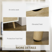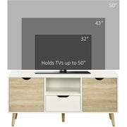 Upgrade your living room and entertainment area with this modern HOMCOM TV stand cabinet. Blending together wood effect doors and a white structure for modern style, this entertainment unit looks great all throughout the home. Formed of a wide top, middle open shelf, drawer two end cupboards. The TV console complete with wooden legs to support properly.