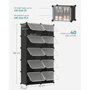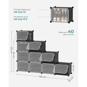 Effortlessly organise your home with Songmics' Plastic Modular Storage System. It holds up to 40 pairs of shoes, bags, and clothing, with sturdy connectors and robust steel wire for safety. Assembly is quick and easy with a rubber mallet and can be adapted to fit different spaces. Clear doors offer dust-proof, waterproof protection with ventilation.