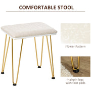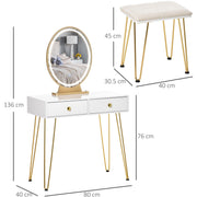 - TWO-PIECE SET: Formed of the dressing table and matching stool. Table is made from sturdy and resilient MDF. Stool filled with sponge padding for comfort. Metal legs in golden colour create a luxury look.