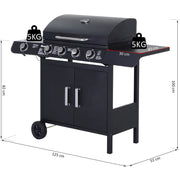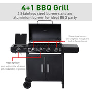The 4 + 1 gas BBQ grill from Outsunny features 4 stainless steel burners and an aluminium side burner, ideal for outdoor barbecue parties. The lid design that helps preserve all the flavours. When preparing for your party, you can put all your grilling essentials and accessories within easy reach on the side tabletop or in the lower cupboard. Add the durable and safe BBQ and enjoy your cooking outdoors with complete peace of mind.