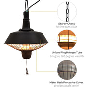 The Hanging Electric Patio Heater is an ideal solution to add both warmth and lights when in cold evenings and be able to enjoy your outdoor activities. Energy-saving halogen heating performs well while the protective structure ensures reliable safety in use. Made from steel with a grill protector, heater for gazebo is ideal to use indoors or outdoors with IP24 rating. Using a vintage pendant style design it is an attractive yet practical heating and ambient lighting solution to your patio, conservatory and match any décor. Fantastic addition for BBQs, parties or other entertaining outdoor activities.