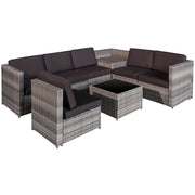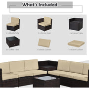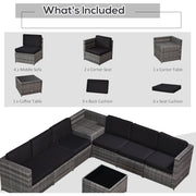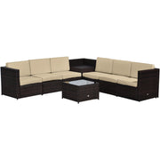 • EIGHT PIECE OUTDOOR SEATING SET: Includes four seats, two corner seats, a corner table and a coffee table with a tempered glass top.