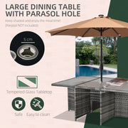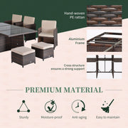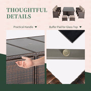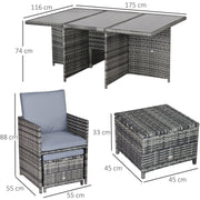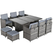 Looking for a stylish and practical outdoor furniture set? Look no further than the Outsunny 11-piece cube dining set. The set features six chairs, four footrests, and a spacious rectangular table, all designed with a space-saving cube design. The chairs and footrests stow neatly under the table, so you can maximize your outdoor space when not in use. The set is made of durable PE rattan over a sturdy aluminium frame, with a sleek tempered glass top on the table. Ideal for any outdoor occasion, from family dinners to garden parties, this set is sure to impress.