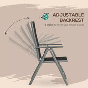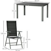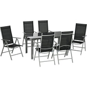Enhance your outdoor dining experience with this 7-piece set from Outsunny. The sturdy aluminium frames of the table and reclining chairs offer durability, while the texteline seats provide ultimate comfort. The tempered glass top table creates a stylish and practical surface for your dining needs. Perfect for summer brunches and evening dinners with friends, this set is a must-have for any garden. Upgrade your outdoor space with this black dining set today.