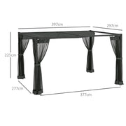 Embrace the ultimate in outdoor sophistication with the Outsunny Metal Pergola with Retractable Roof and Mosquito Net. This elegant structure, spanning a generous 3.97 x 2.97 meters, becomes the centrepiece of any garden, patio, or backyard, inviting you into a world of serene comfort and stylish outdoor living. Ideal for both intimate gatherings and larger social events, its versatile design allows you to create a customized ambiance - from sun-soaked brunches to cool, shaded evening soirees.