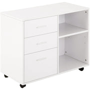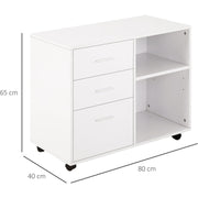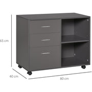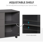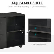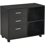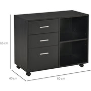 Give your office style and storage all at once with this cabinet from HOMCOM. It features two open compartments and three drawers, giving you plenty of space to keep files, folders and stationary organized. The shelf on the right can be adjusted to suit your needs. Four castor wheels ensure easy movement, with two lockable to keep stationary. It's made from particle board, ensuring it is tough and durable for everyday use, in a black colour for a sleek addition which sits well-placed anywhere.