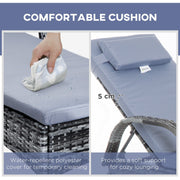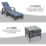 The rattan patio chaise lounge set from Outsunny comes complete with 2 loungers, 1 side table and cushions. The seat has 5 adjustable positions to give maximum relaxation and comfort. The side table also has a glass top to keep your drinks at easy reach, and the set can be used indoors and outdoors.