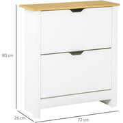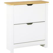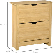 This compact shoe cabinet from HOMCOM will help to keep your home effortlessly decluttered. A particle board construction ensures a tough and solid frame, with a smooth coating so it can be cleaned easily. Two pull-down drawers hold two shelves each, which stores up to 12 pairs of shoes for easy organisation. A groove handle allows you to open and close. An oak-tone top allows extra holding and display space, with feet to keep the unit balanced.