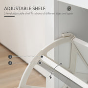 Too many shoes and nowhere to keep at home? Then it's time to keep them organised - look to this HOMCOM cabinet. It comes with two tipping drawers; each hold six pairs each, with an adjustable shelf in each for more flexibility. Each tipping shelf comes with two metal handles to open and close easily. White in colour and clean boxy in shape, this piece is modern design which is suited for practically all home interiors. Finished with a flat top shelf.