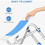 Adjustable shower chair designed to assist elderly, injured or those needing extra help in the shower or tub. It features four adjustable heights for comfortable and secure seating, a curved seat with EVA padding for extra comfort, and large suction foot pads for enhanced stability. This chair is a great addition to any home.