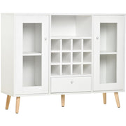 Make home dining storage easy and stylish with this multi-use cabinet from HOMCOM. Generous in features, it combines a 12 bottle wine rack, top shelf, small drawers and a cupboard on both ends -giving you lots to ensure your space is kept tidy and organised. The two cupboards are fitted a shelf for extra organisation. Made from particle board, this piece is durable for everyday use, with the five wooden legs keeping it steady on the ground. Finished with glass panels on the door for a sleek look and handles to open and close them easily.