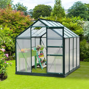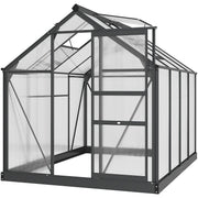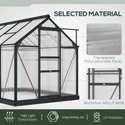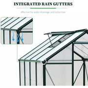 Create the perfect growing environment for your garden plants with this Outsunny 6x8ft Greenhouse. The clear polycarbonate panels let in maximum light while keeping out harmful UV rays, promoting healthy plant growth. The walk-in design with a slide door and push-open window provides easy access and ventilation. The powder-coated aluminium frame and included ground stakes provide a sturdy structure that can withstand various weather conditions. With a lift-up roof that stays in place, it's easy to regulate temperature and humidity. Start growing your dream garden today with this versatile and practical greenhouse!