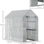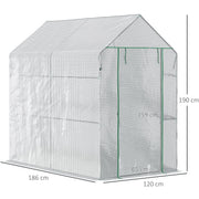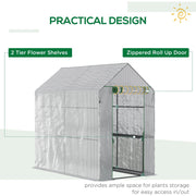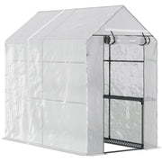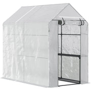 Experience the joy of year-round gardening with Outsunny's Walk-In Greenhouse. This 6x4ft greenhouse offers a steel frame with a sturdy PE plastic cover to protect your plants against the elements. The zipped door provides easy access, while the four wired inner shelves offer ample space for storage and organization. With a sheltered indoor space, your plants are shielded from wind, rain, and harsh sunlight. The overlong cover offers extra stability and the accessories included ensure a reliable structure. Grow crops, vegetables, flowers, and more with ease and fall in love with your garden all over again.
