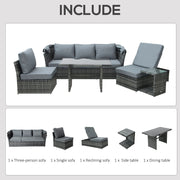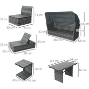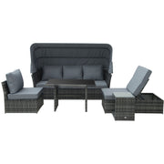 Enhance your outdoor living with Outsunny's 5 PCS Rattan Wicker Sofa Set. Relax in style with the adjustable canopy, reclining sofa and comfortable cushions, perfect for reading or taking an afternoon nap. The side table keeps drinks and snacks within reach while the dining table is great for entertaining family and friends. Feel the soft and supportive cushions against your skin, while the canopy blocks out harsh sun rays yet lets in a gentle breeze. Durable and easy to clean, it offers a fun and comfortable outdoor gathering place for ultimate relaxation.