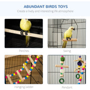 - Spacious bird cage: Lots of room for pets to stretch and flap their wings. Includes a swing, ladder, hanging toys, bowls and perches – everything needed for comfort and entertainment.