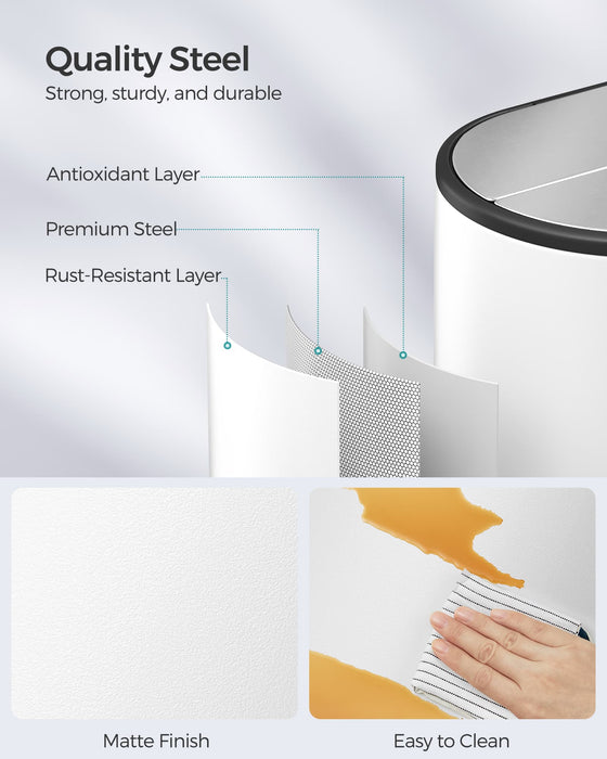 Make sorting your waste a breeze with this stylish dual-compartment recycling bin from SONGMICS. Finished in cloud white and metallic silver, it combines a sleek look with practical design, perfect for modern kitchens. With separate 30L and 20L compartments, managing your rubbish and recyclables has never been easier.