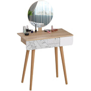 Bring beautiful and stand-out style into your everyday routine with this dressing table from HOMCOM. Made from wood, the frame is crafted into a compact yet semi-spacious design which features a large pull-out drawer, giving you room for keeping all your cosmetics, toiletries and makeup discreetly stored away and within easy reach. The tabletop also gives you lots of holding room when getting ready, with the round mirror allowing you to see your reflection easily. Four outward-angled legs keep this piece balanced and stable, with pretty line patterning on the drawers to finish.