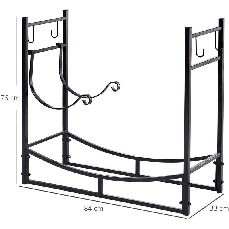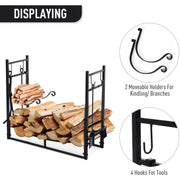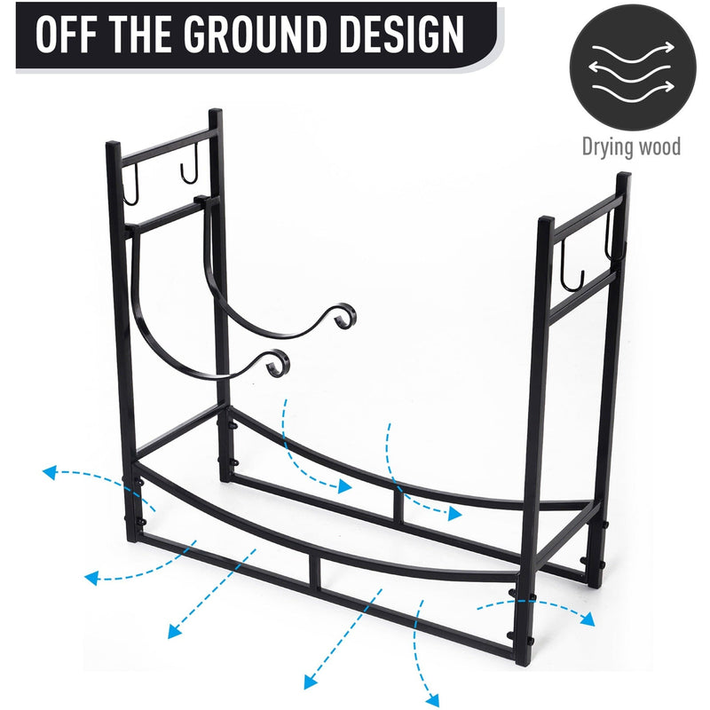 - MULTI-FUNCTION: This large wood rack comes with 2 moveable holders for kindling, and includes 4 hooks for tools, offering storage space for fireplace accessories. Ideal for drying wood, its off the ground design allows for air flow to keep dry