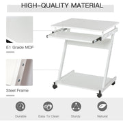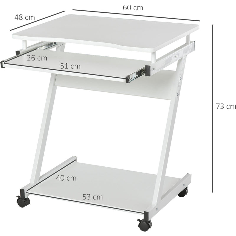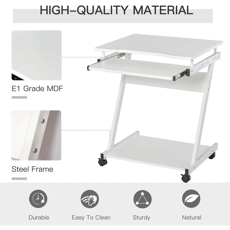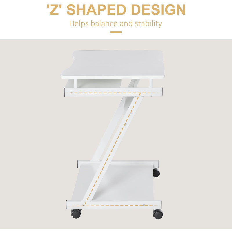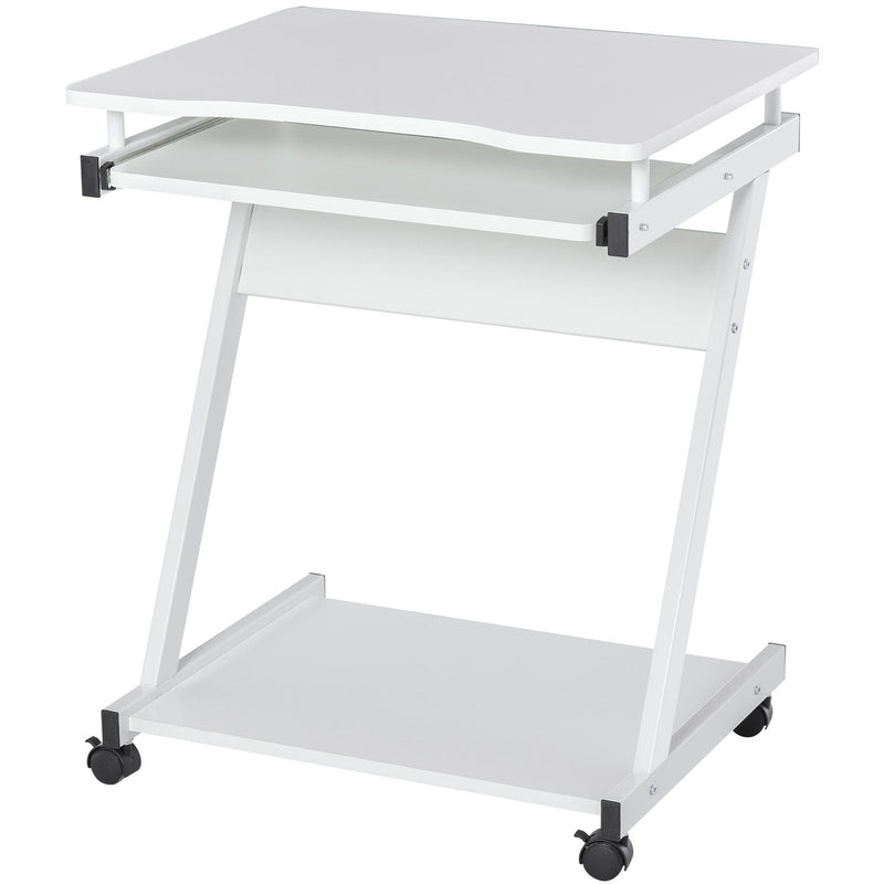 Keep your working times clean and clutter-free with this small desk for home office from HOMCOM. The frame is made of metal for a sturdy structure, crafted into a 'z' shape design which enables it to keep balanced and stable. It features an open tabletop, slide-out keyboard tray and bottom shelf, giving you plenty of room for working and storage. 4 locking wheels at the bottom, making this pc desk easy to move around and keep stationary. A modern piece perfect for all home and office spaces.