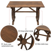 This wood courtyard table adopts high quality fir wood material to create a practically indestructible chair. It can deal with bad weather and is not warp, rust, rot, dent or peel. It can be used as coffee table, dining table, its wheel-shape legs and natural carbonized wood color will be an addition in your garden, patio, outdoor party. Easy to assemble, all necessary hardware included.
