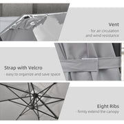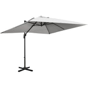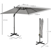 Stay cool and comfortable with the Outsunny Square Cantilever Parasol. This 2.7 x 2.7m light grey parasol provides ample shade and its unique hanging design ensures your view remains unobstructed. The parasol's canopy is not only adjustable at four positions between 15-60°, but also features a built-in air vent that allows air to pass through, preventing it from turning inside out. The 360° rotation feature allows you to easily adjust the parasol's position for optimal coverage. Constructed with a strong aluminium frame and metal ribs for extra support, this parasol is a perfect blend of form and function.