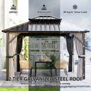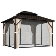 Permanent Garden Gazebo with 2 Tier Steel Roof, Curtains and Netting for Year Round Shelter and Privacy, Brown & Black