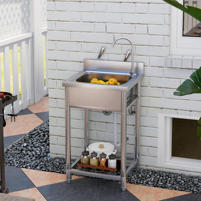 Enjoy the luxury of hot and cold running water anywhere you need it with the HOMCOM Stainless Steel Utility Sink. Designed for versatility and durability, this freestanding sink is your perfect companion for outdoor kitchens, laundry rooms, gardens, or garages. With a spacious basin, useful backsplash, and built-in storage shelf, it combines practicality and cleanliness in one sleek package.