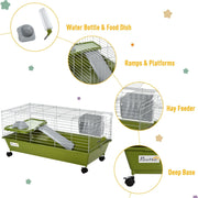 - MULTIPLE FEATURES: This cage for your small pets provides them with an elevated platform, a ramp for easy up and down, hay feeder, water bottle, and food dish for daily necessities. 4 universal wheels for easy movement and transportation, 2 with security brake to keep it in place when not in use.