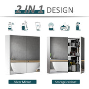 This HOMCOM stainless steel wall mirror medicine cabinet adds a touch of contemporary style and bright reflective surfaces to any room. Double doors open to reveal three fixed metal shelves that provide ample cabinet storage for all of your toiletries and beauty accessories, holding up to 12kg of weight. While it was meant to be a bathroom mirror, it can be used in bedrooms, closets, or in hallways to add extra mirror surfaces and storage.
