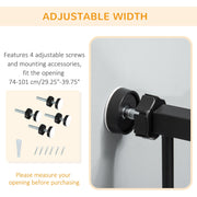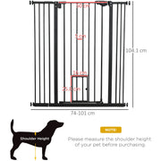 Keep pets away from rooms when required with this PawHut pet stair gate. Made from sprayed metal with lead-free treated surface for strength and safety. 74cm to 101cm wide, allows to fit into different sized spaces with ease while 104.1cm high - the extra tall gate makes it difficult for pets to get over. Slide and lift, the handle is easy to open, allowing you to pass through quickly without your pet escaping for security. Cat door provides a secure separation between cats and dogs.