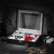 - Elegantly Crafted: Experience a blend of luxury and functionality. The box features a sleek black faux leather exterior, complemented by a dark gray velvet lining. The clear glass lid and shining metal clasp enhance its sophisticated appeal.