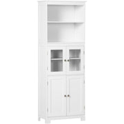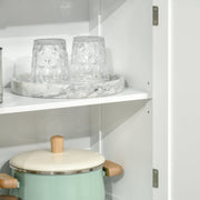 Need some more storage options in the kitchen? This HOMCOM pantry cupboard is here to help. A clean, white design makes this storage unit versatile, with beadboard door panels, glass panels and metal handles for a sleek look. Storage comprised of two shelves, glass door cabinet, and bottom double-door cabinet - plenty of organisation, with mess out of sight.